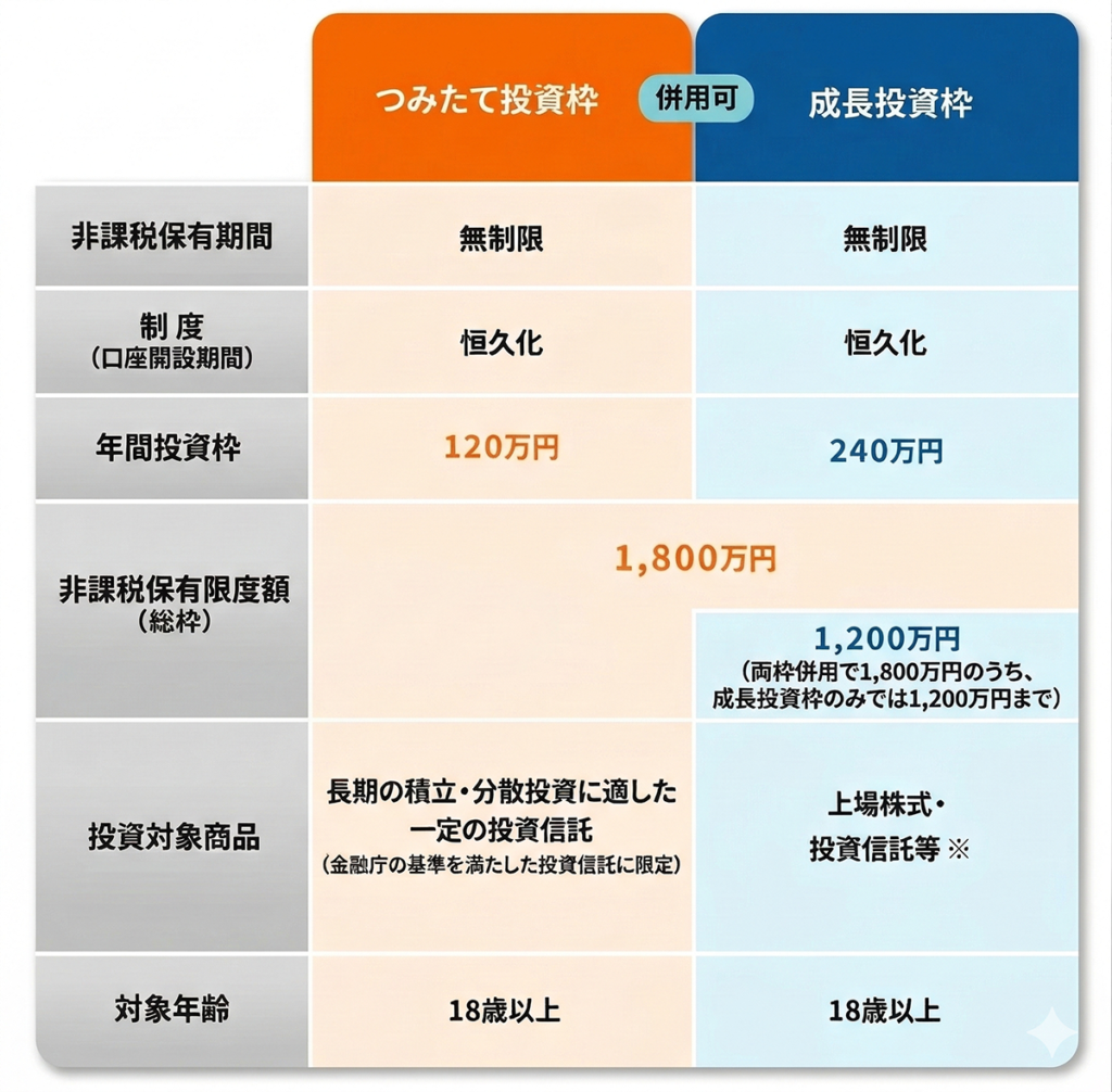 成長投資枠は旧制度の「一般NISA」、つみたて投資枠は「つみたてNISA」に該当します。以前はどちらか片方しか利用できませんでしたが、新制度以降は併用できるようになったことも特徴です。